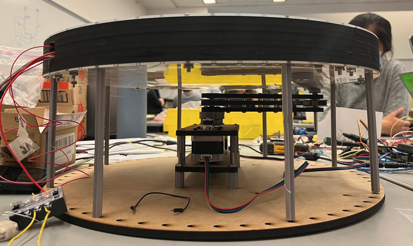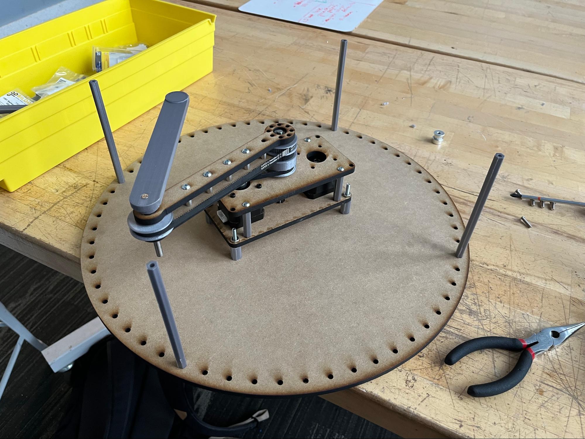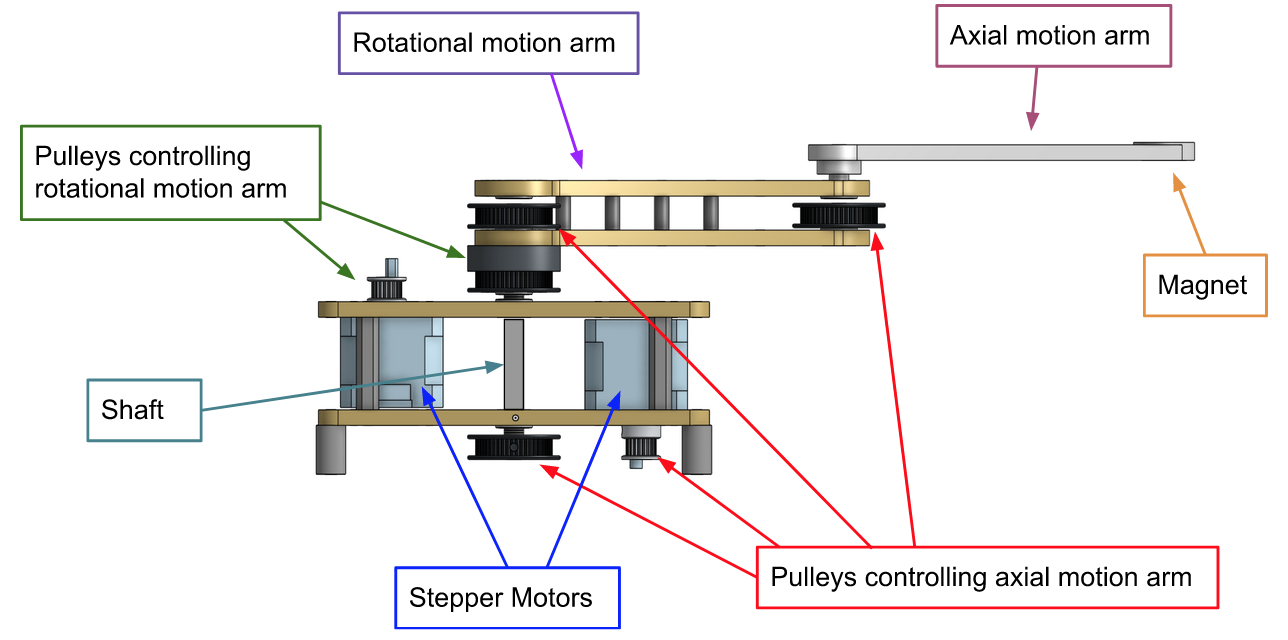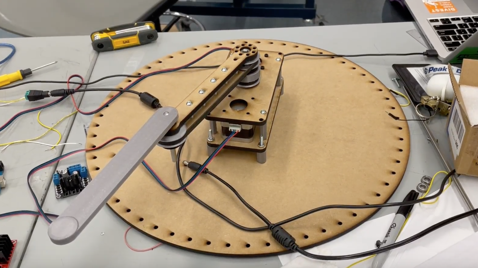 The uniaxial arm controls both the rotational motion and the axial motion through a single axis. This, as opposed to an x-y gantry, allows us to keep the enclosure contained to a circle. We used timing belts around the pulleys to control both arms separately. The rotational motion arm and the plates holding the motors are laser cut ¼” MDF. The axial motion arm and the black pulleys are 3D printed. All other parts, including the standoffs, shafts, and metal pulleys are all COTS (Commercial Off the Shelf) parts.