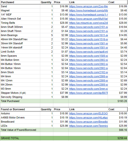 We were able to use scrap material we found and already had motors and an Arduino to use for testing in sprint 1 and sprint 2. For the final sprint, we bought materials for the final enclosure, which left us under the $250 budget. This included the MDF for the enclosure, timing belts, shafts, standoffs, bolts, spacers, stepper motors, sand, and magnets. We were able to either find or borrow the arduino, motor drivers, breadboard, and LEDs for the final design, so this didn’t exceed our $250 budget.