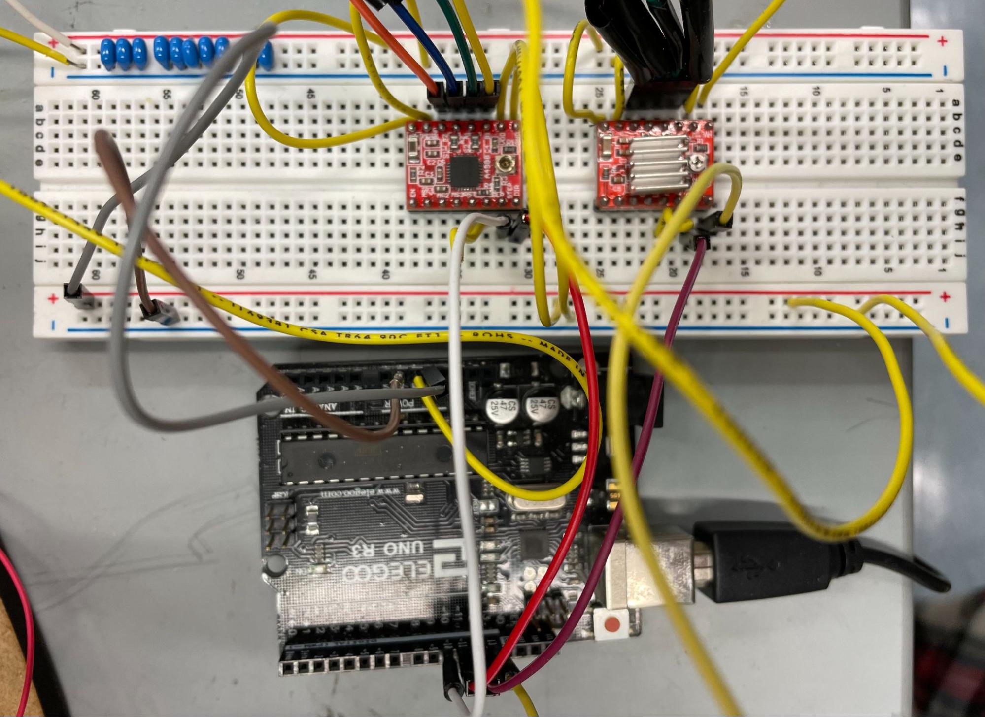 Switching to stepper motors required changes to be made to the electrical design. At first, we had some difficulty determining how to run the motors. We started out trying to use the same motor shield but quickly realized this was not an option after burning it out. Next, we tried to use an L298N motor driver to control each motor. This had some success initially but stopped working at later steps. After extensive debugging, we determined that one of the drivers had broken somehow after our first attempt. Our final method of controlling these motors was with A4988 stepper drivers. These ended up being successful in driving the steppers without burning out.