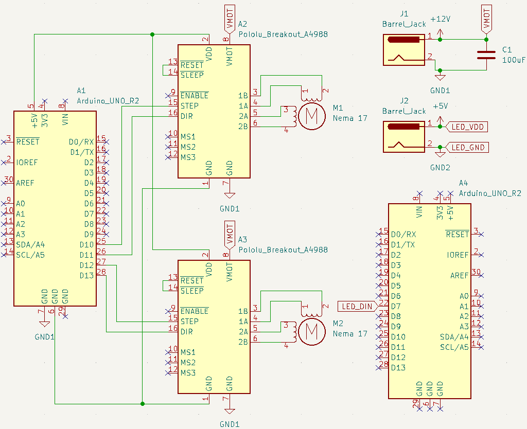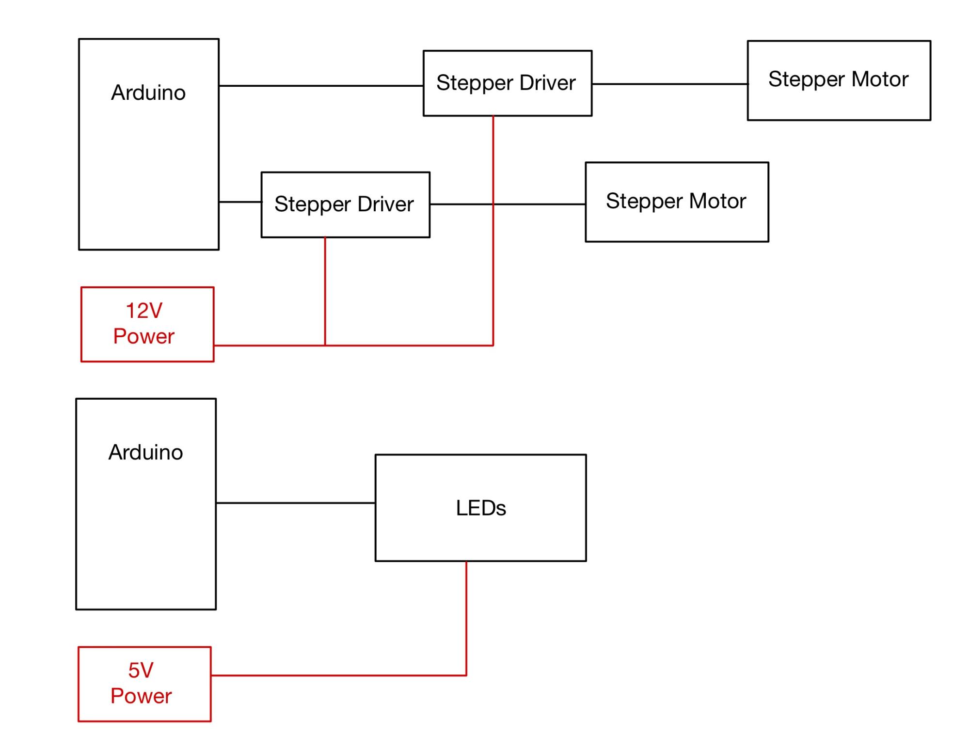 The electrical system of the sand table consists of two main sections. The first part consists of two Nema 17 stepper motors, two A4988 stepper drivers, and an Arduino to control the drivers. We used a 100µF bypass capacitor to smooth out the 12V power supply. The second part is the strip of LEDs, which has a 5V power supply and is controlled by a separate Arduino.