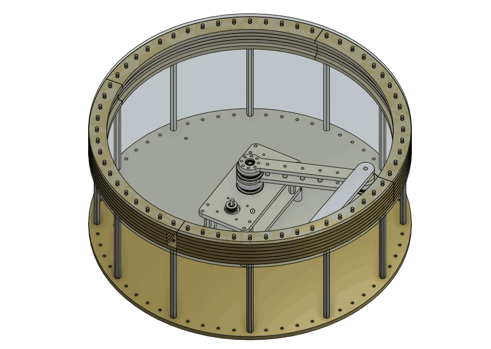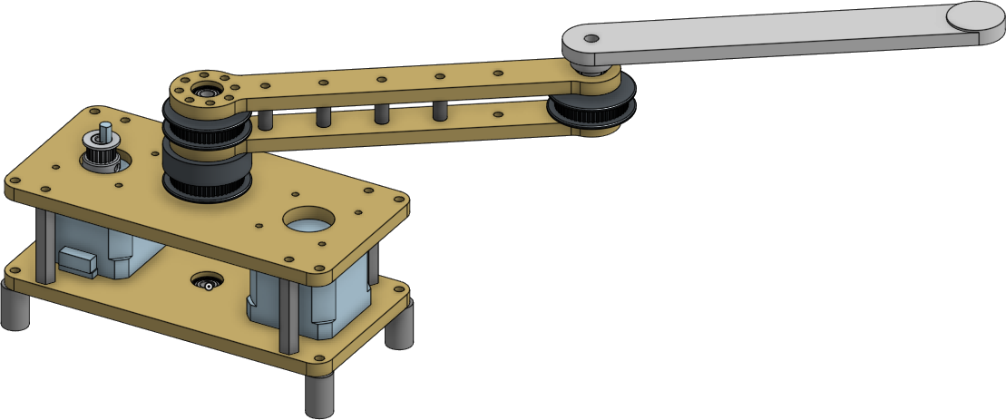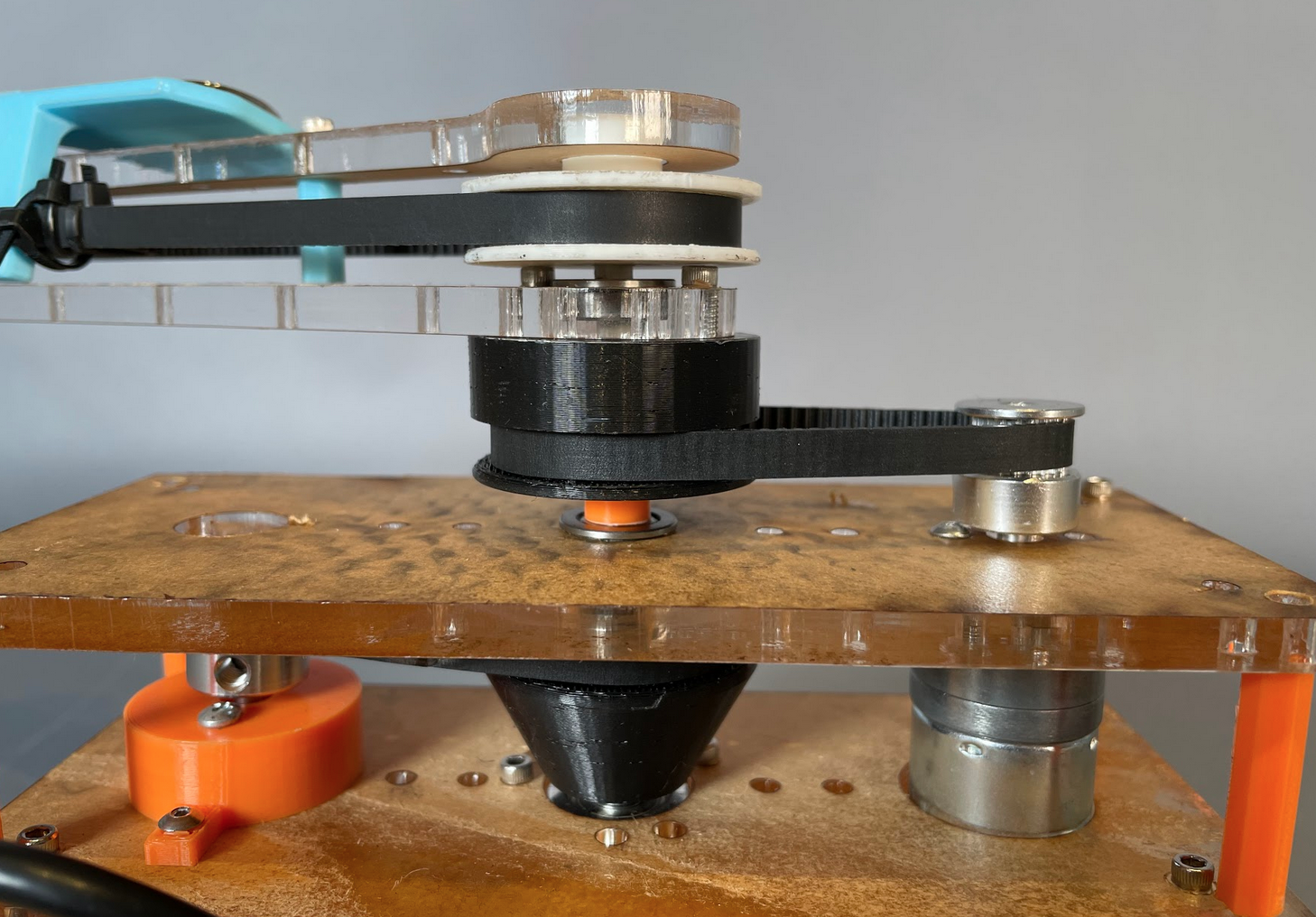 One primary design decision we made at the start was the need for a coaxial mechanism. By having both the actuation for radius extension and rotation on the same axis, we can eliminate the risk of tangled wires and reduce the required weight on the movement arm. The primary disadvantage with the coaxial design is an increase in complexity for the rotation system. We approached this challenge by using timing belts due to their lightweight and ease of construction with 3d printed pulleys. However, for our first iteration we aimed to purchase as few parts as possible, so we ended up making our own continuous timing belts which proved to be challenging.