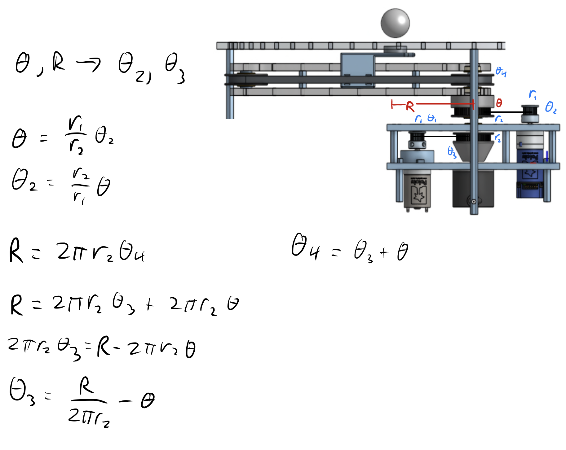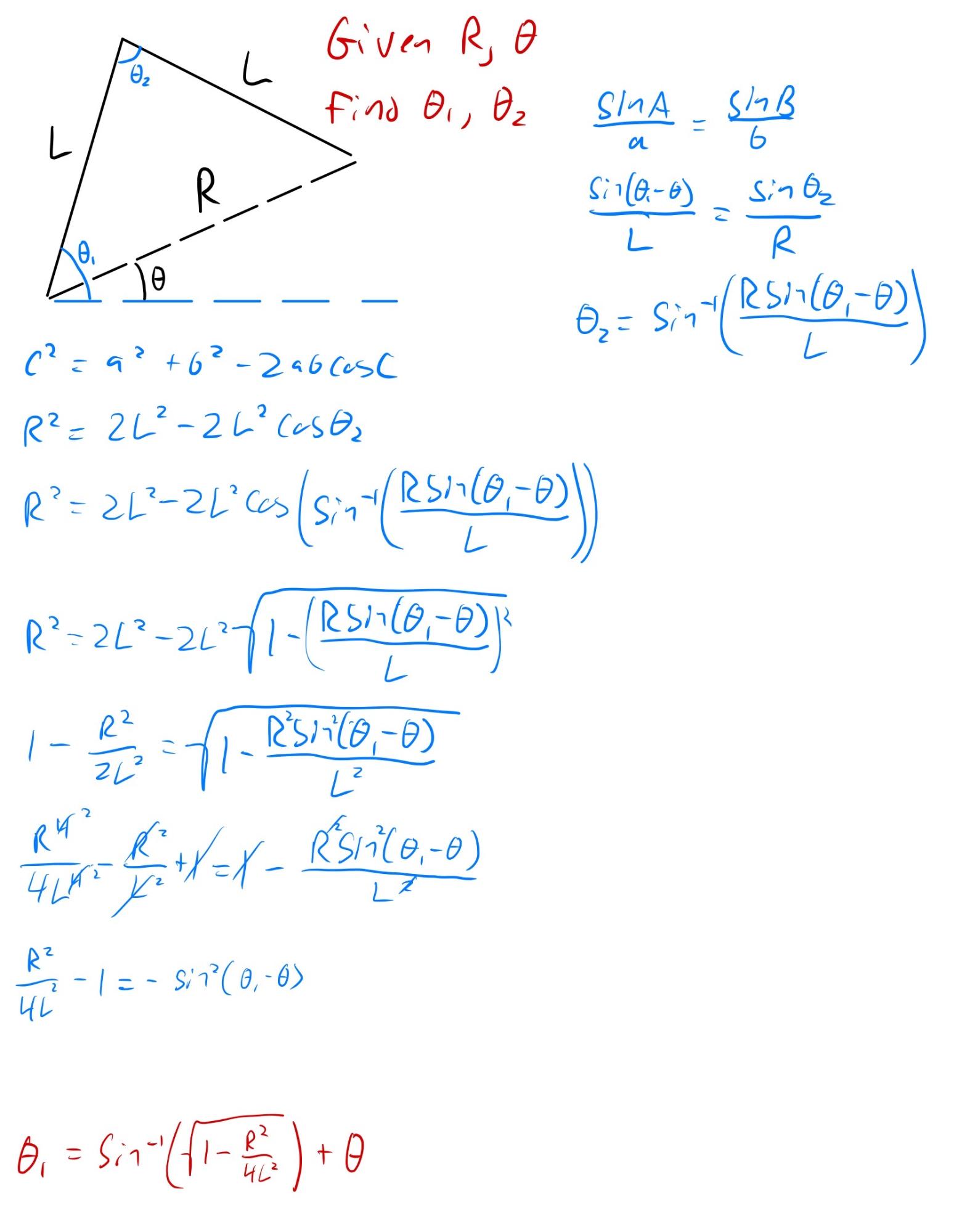 Similar to our previous design, we needed to convert desired polar coordinates into motor positions. However, with the new design, we needed a different set of equations to perform the inverse kinematics, detailed in the software section. With desired angles computed, we use the number of steps per revolution to determine how far to step the motors.