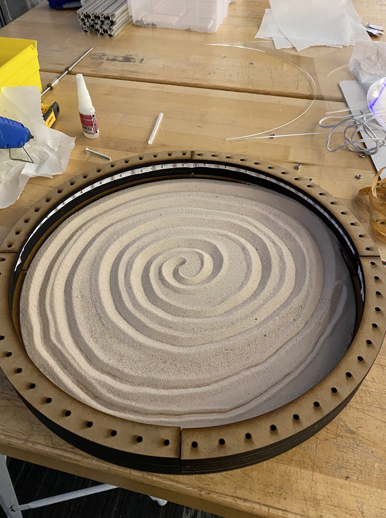 We were able to go back to our original plan to make patterns using small motions between points. The only issue with this method is that the stepper motors do not create much torque. There is a lot of friction between the ball and the sand, so the motors sometimes miss steps. However, this has proved to be a manageable issue by slightly increasing our maximum distance to compensate. At the end of this final sprint, we are able to create patterns such as circles and spirals that move inward and out.