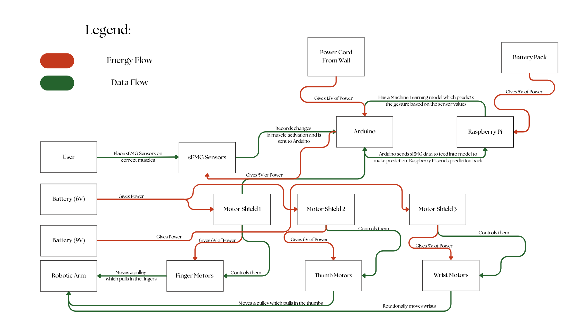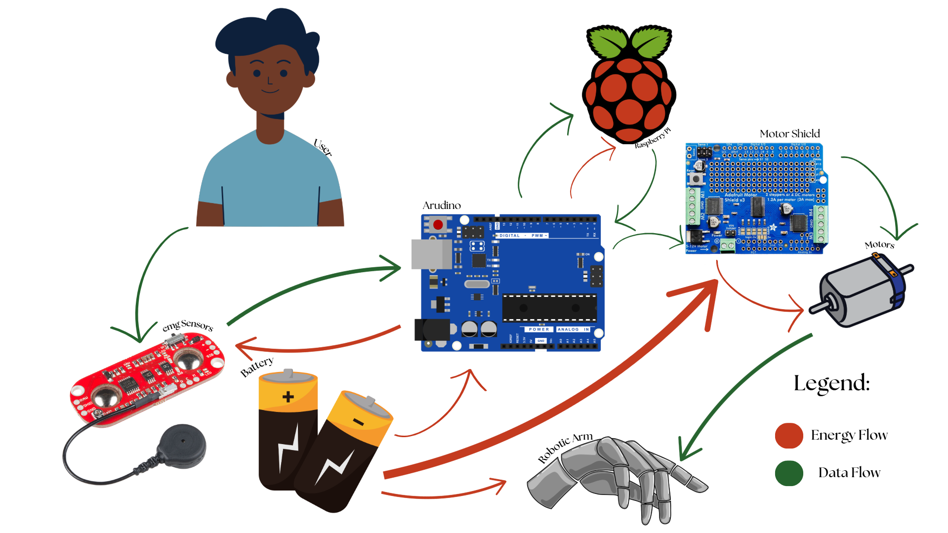 This project aims to develop a prosthetic arm that uses surface electromyography (sEMG) data to replicate natural hand movements. The prosthetic will mimic various hand gestures, including forming simple gestures like rock-paper-scissors, moving the wrist, and flexing the fingers. By interpreting sEMG signals from sensors placed on the user’s arm, the system will control the prosthetic’s fingers and wrist to create intuitive, fluid movements.