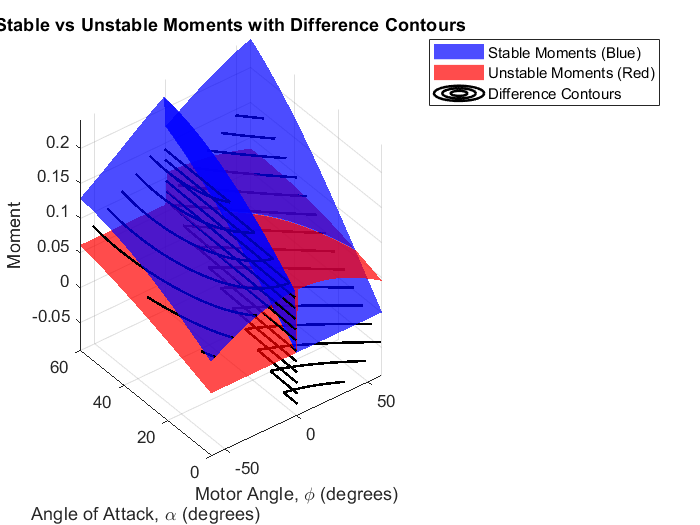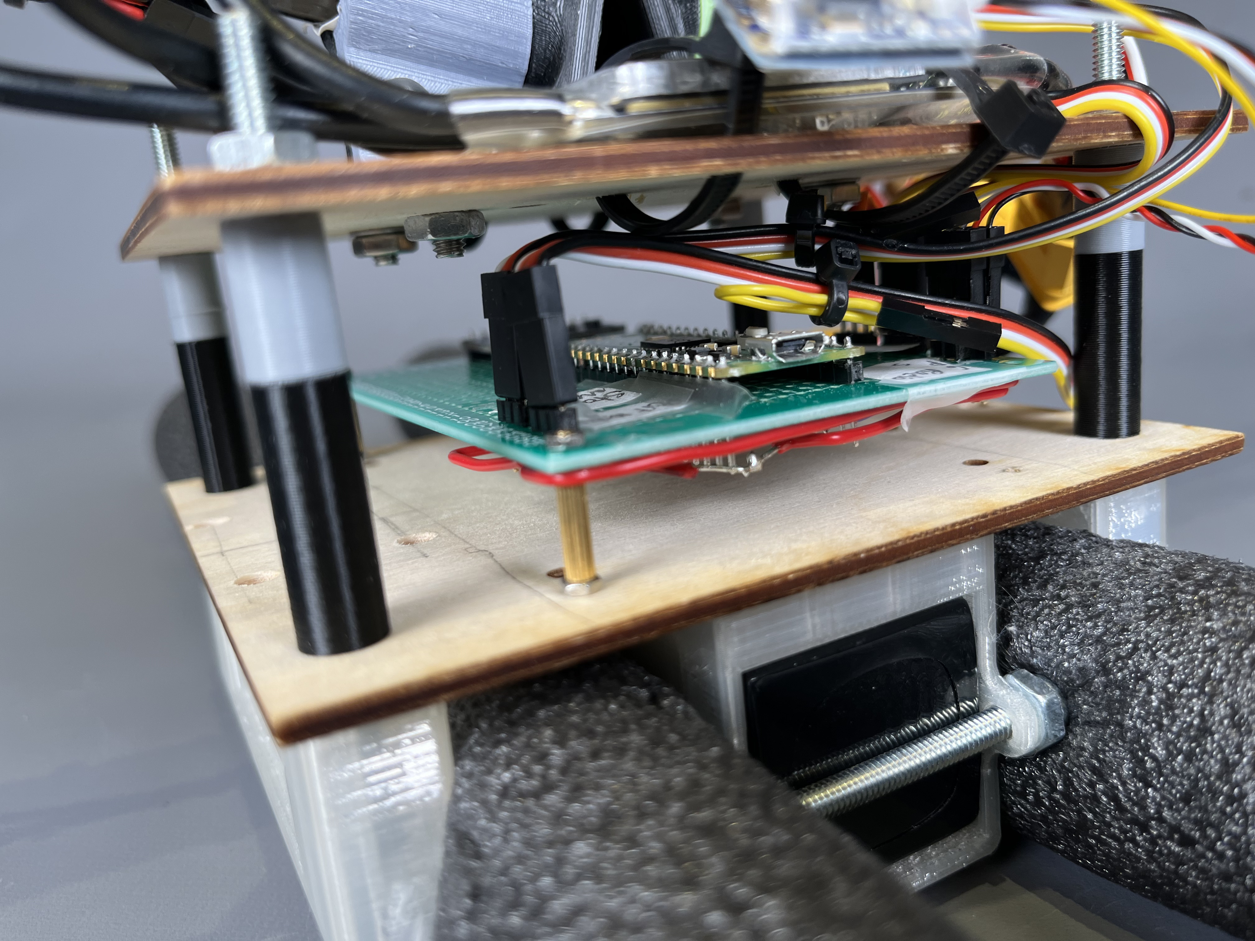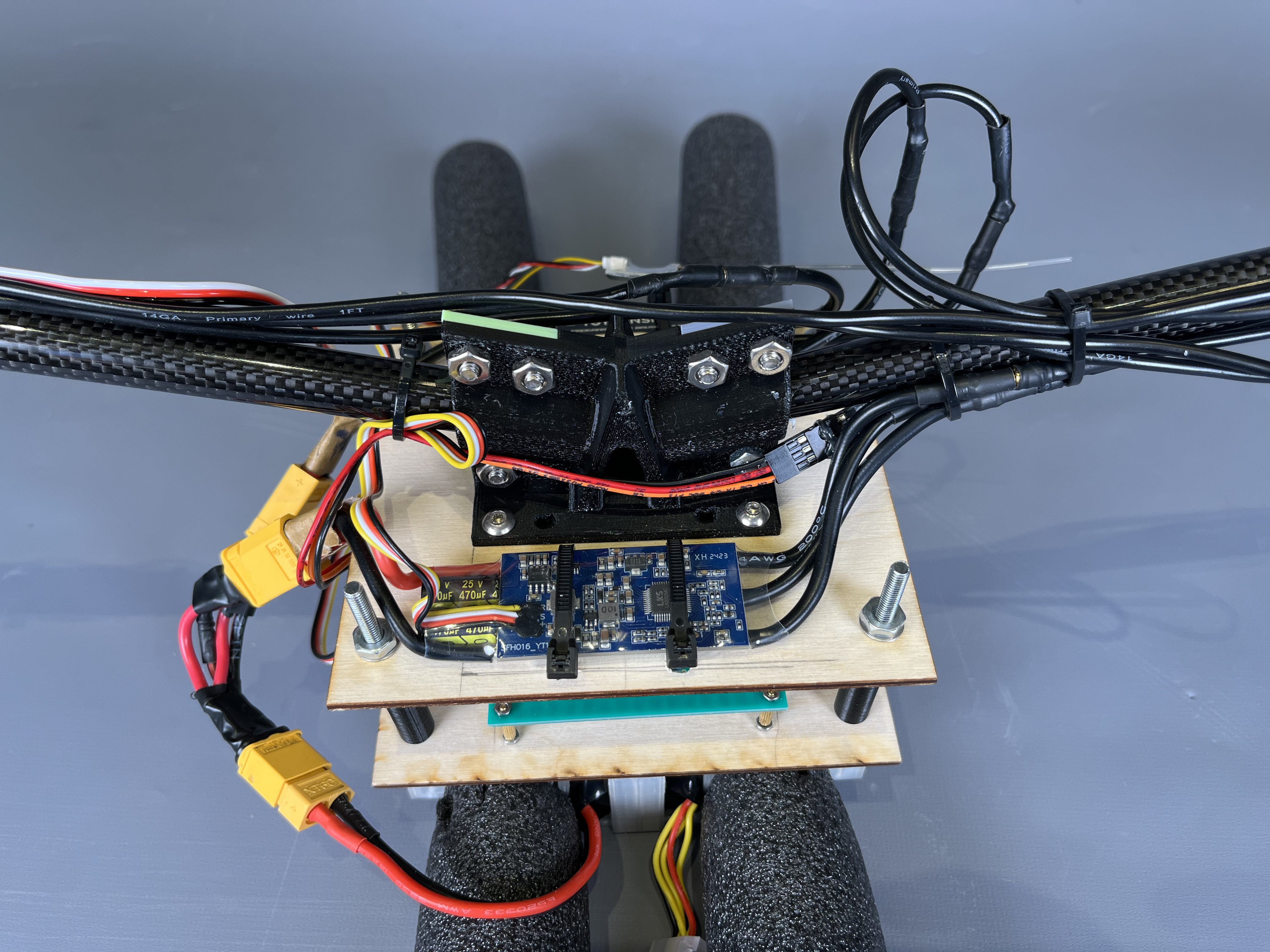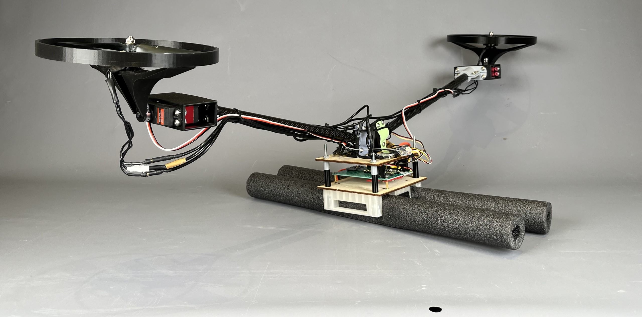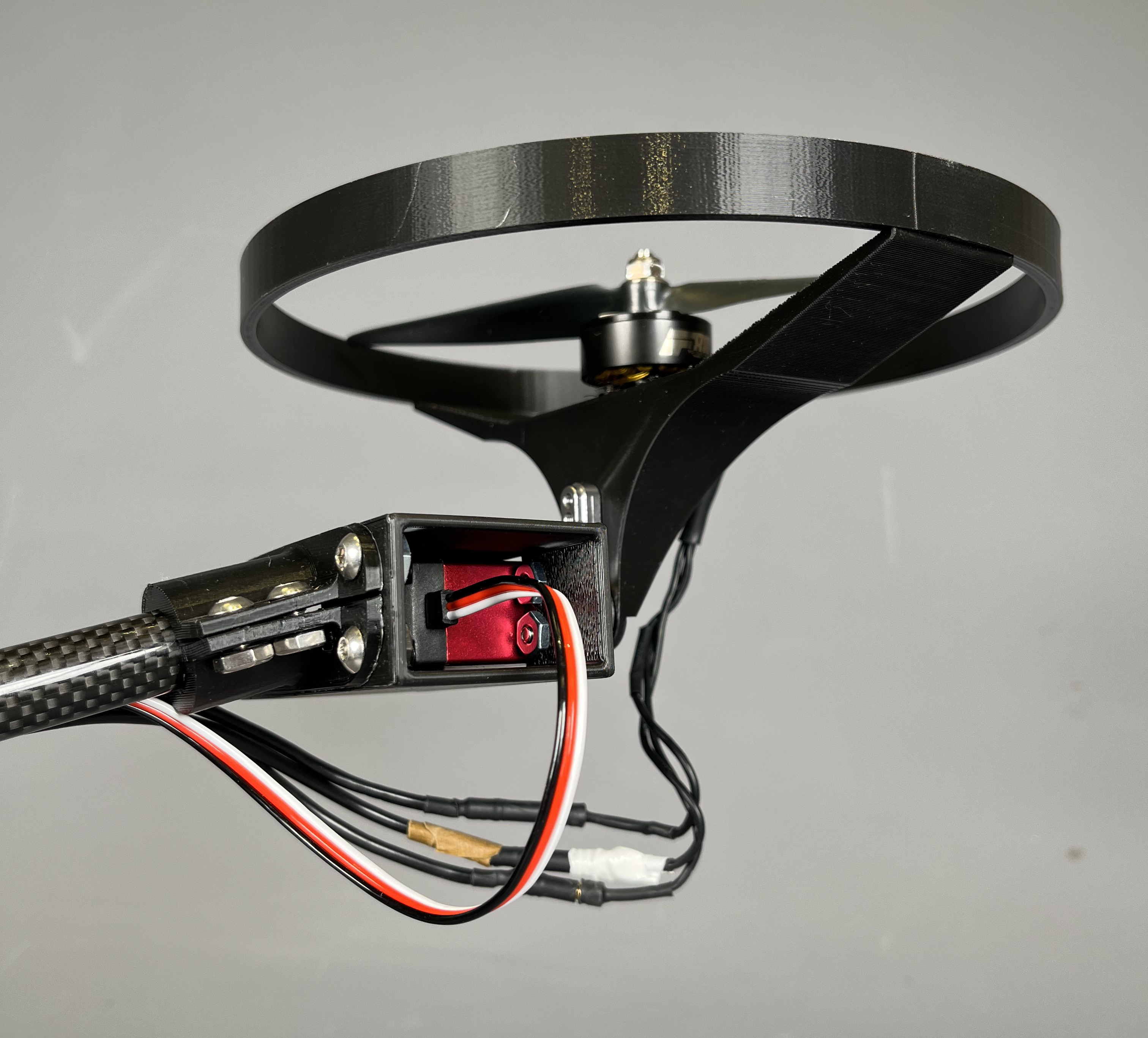 The priorities for this mechanical design were light weight, stiffness, and resilience. As a bicopter, the vehicle mounts a pair of drone motors to servos on PLA printed motor mounts, which connect the servo horn and the motors, with holes for machine screws and for the driveshaft to be able to rotate. These mounts are each designed with a built-in circular propeller guard which prevents damage to the aircraft on impact. As a testbed, protecting the most fragile parts of the aircraft, (propellers and electronics) is critical. The servos are likewise mounted in 3D printed PLA pods attached by clamps to carbon fiber tubes. The clamps are compressed onto the carbon fiber tubes with screws before attaching to the servo pods, to prevent sliding or rotation. The carbon fiber tubes balance stiffness with lightweight. Although the motors and propellers were chosen for maximum thrust, minimizing mass was still important, as we needed to add counterweights (in the form of extra screws taped to the airframe) for superior balance. The servos tilt the motors, changing the direction of thrust forces, to create pitch and yaw moments. Roll moments are created by changing the magnitude of thrust forces.