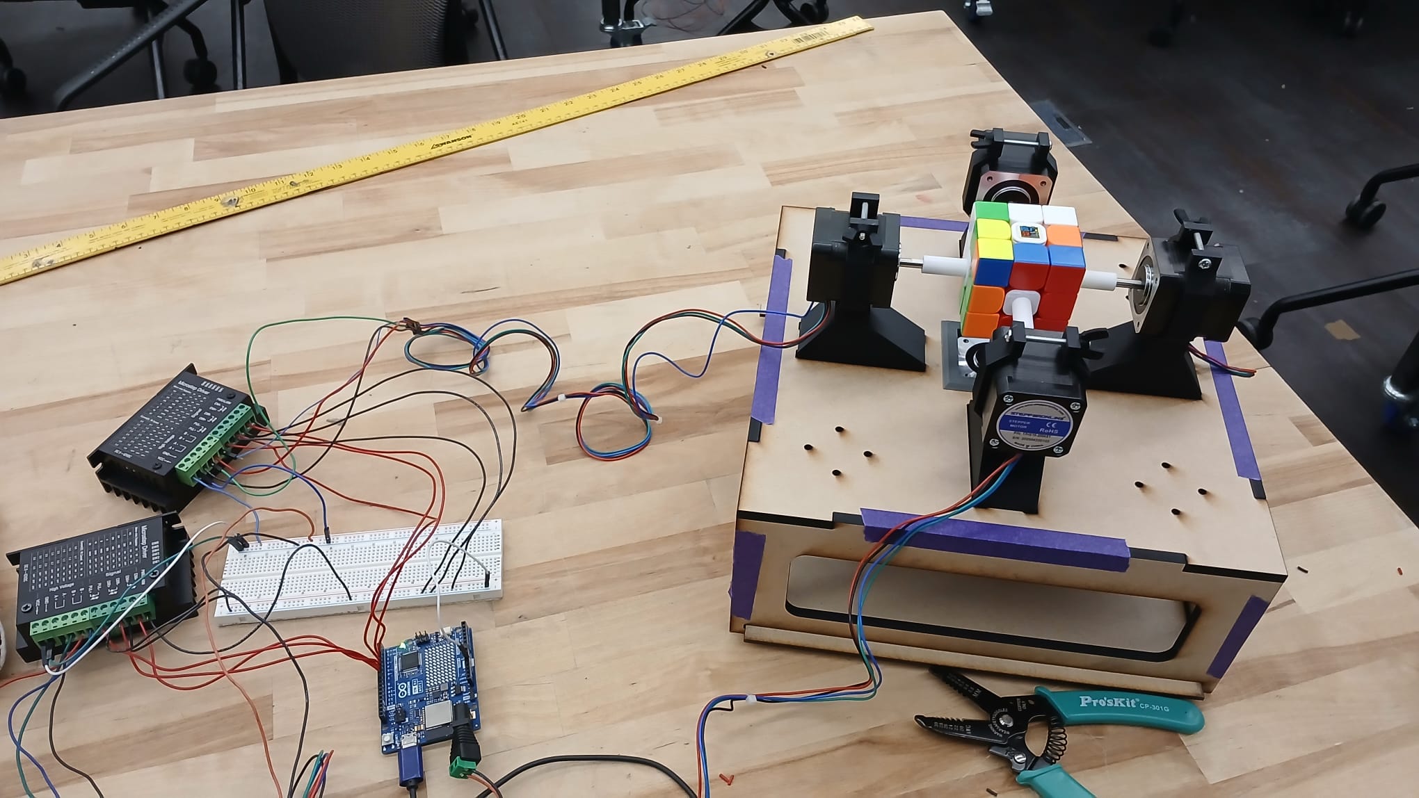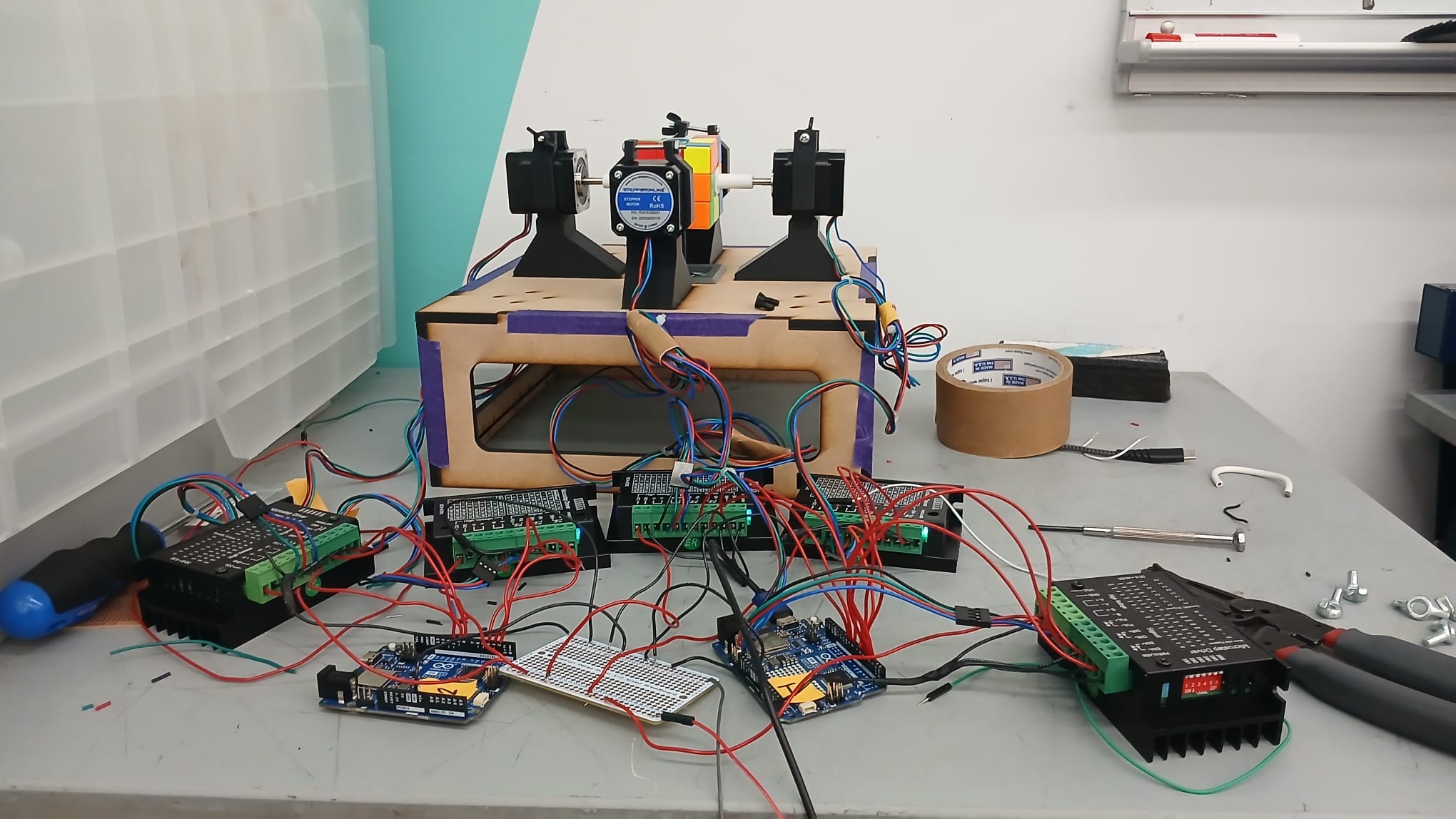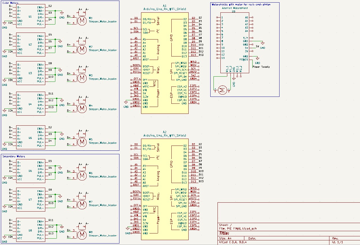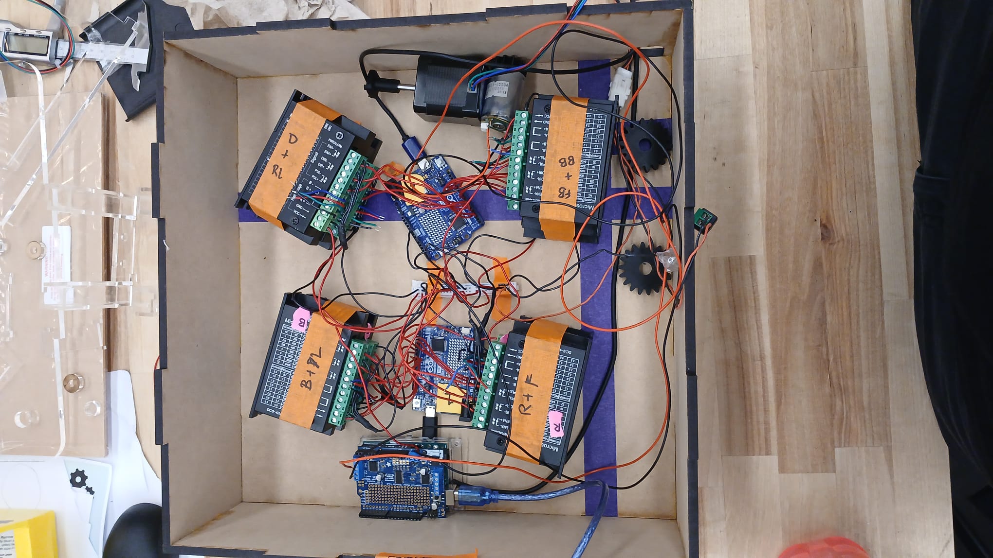 We use three Arduino Uno R4s to control the motors. The Arduinos receive commands from the Raspi through Serial input via USB cable. The commands from the Raspi are in the form of a 3-digit integer. The first digit corresponds to the Arduino board ID, the second identifies the motor, and the third digit informs of the direction to rotate.