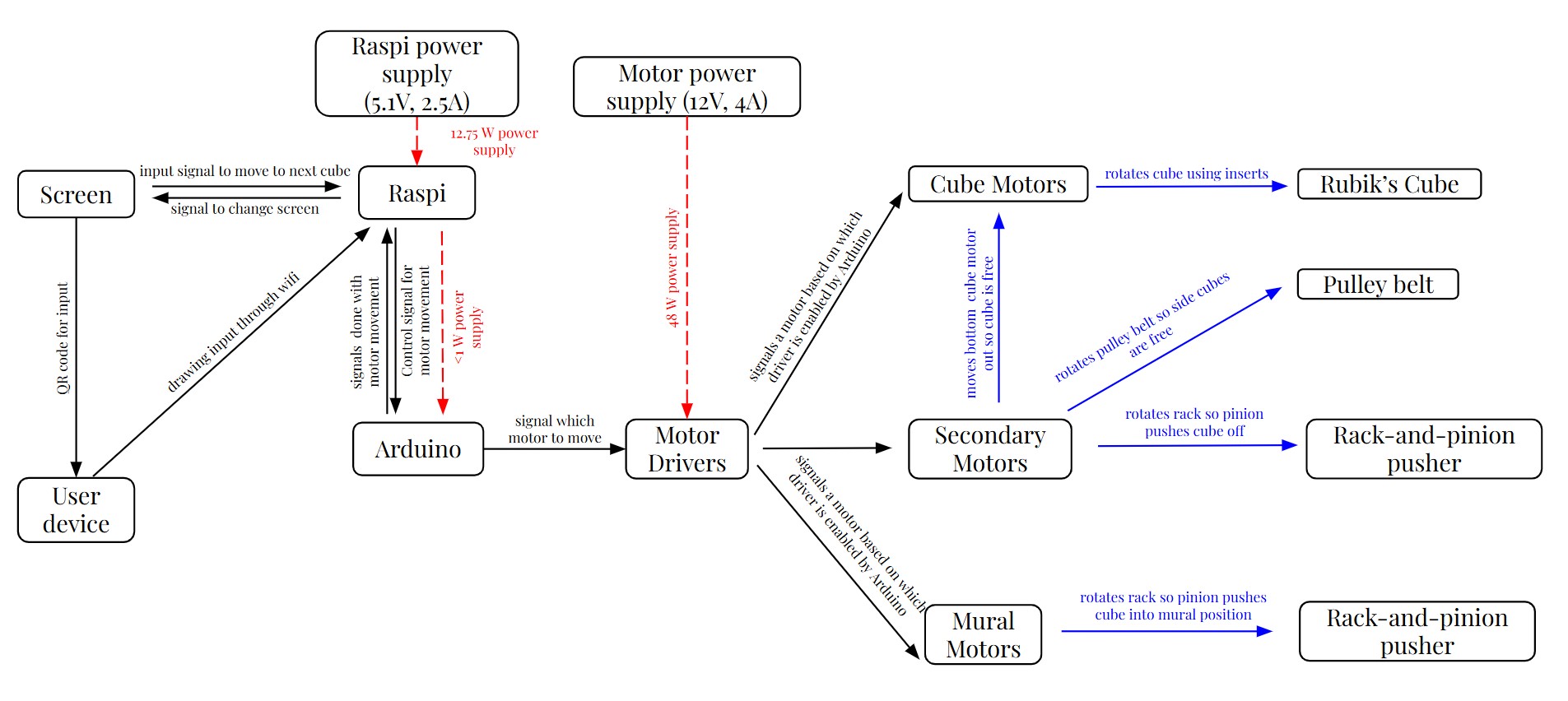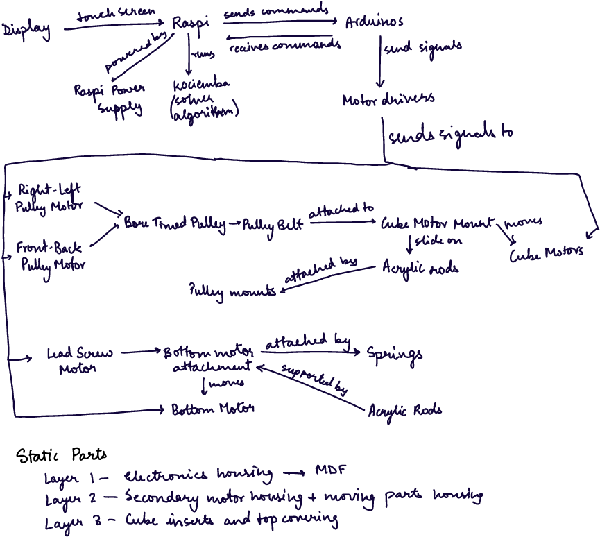 As seen in the diagram above, the motors act as the bridge between the software and mechanical parts of this project. The Raspi sends control commands to the Arduinos which send control signals to the relevant motor driver, moving the motor and driving the movement of the mechanisms.