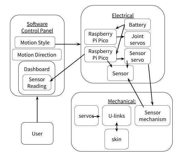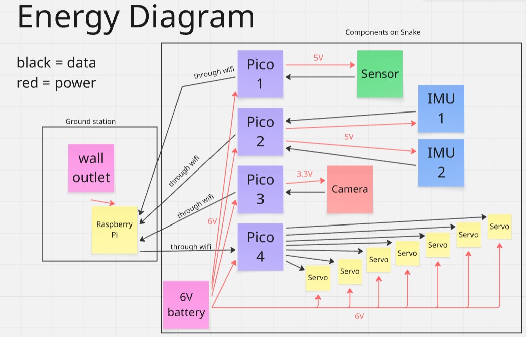 Energy and data flow through several paths in our integrated system. One challenge that we faced with integration is the weight of the power source, which in our case was a NiMh battery. We found that it weighed the tail down, and therefore shaped decisions about motor power and mechanical design around this.