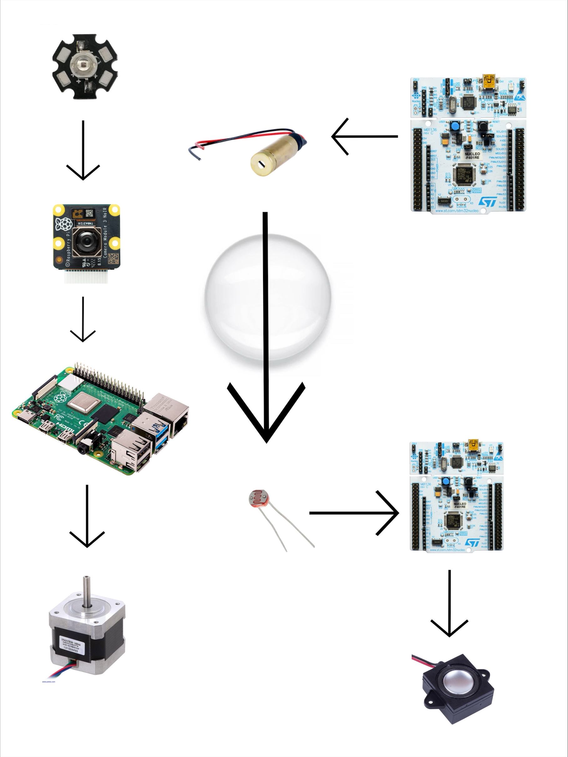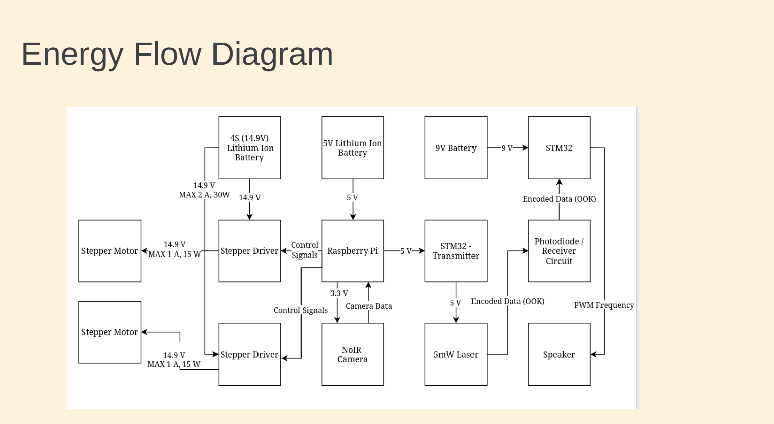 There are two different systems with different power requirements, and as such, we have multiple different power sources. A 14.9V Lithium Ion battery that provides power to the motor drivers and the motors. The motor drivers get their control signal from the central RasPi, powered from a separate 5V Lithium Ion battery. That RasPi also provides power to the NoIR camera, which feeds IR camera data back for processing tracking information. Finally, the RasPi provides input power to an STM32, which is responsible for switching the FET controlling the laser. That subsystem is completely electrically isolated from the next. The Receiver STM32 is powered from a 9V battery and is responsible for reading the changing voltages from the photodiode sensor, processing data, and outputting PWM signal to a speaker.