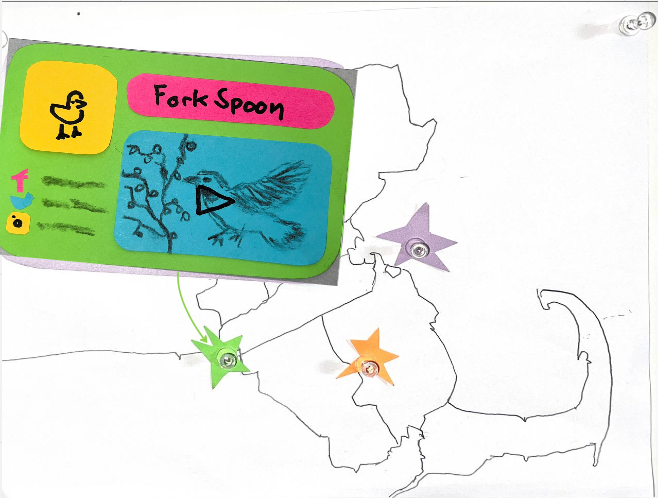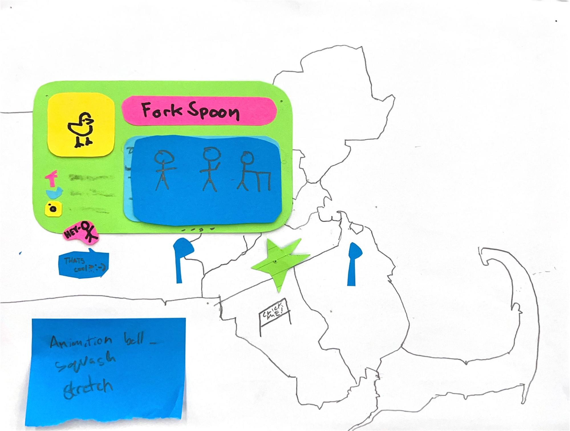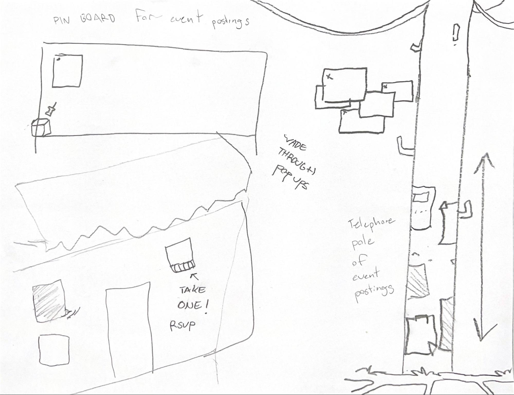 In our second co-design we were able to meet physically, with a local boston independent animator, who we'll call by a pseudonym of “Bug”. We took several paper prototypes, scissors, and sticky notes to a south station cafe, and got to dive into the nitty gritty of the form and function of the user interfaces. We were able to take the idea of a physical pinboard proposed by our first co designer, and get sketches of fun and playful ways to bring this interface to life. Shown below, our co-designer came up with 3D telephone poles with stabled flyers, a store front window, a cork board with digital push pins, and even a page cluttered with popups to wade through.