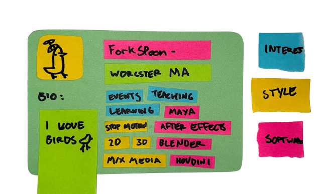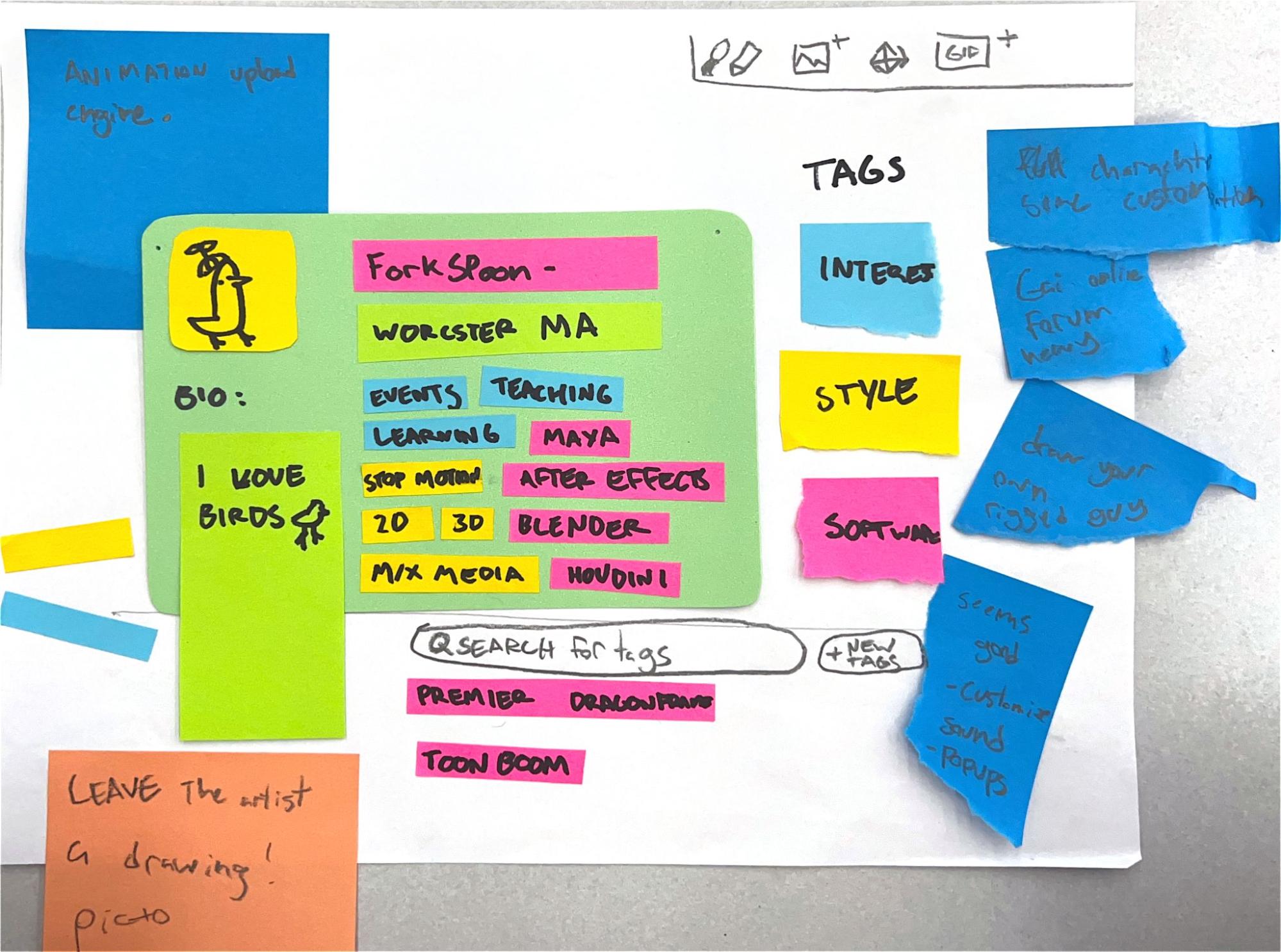 Our first codesigner was a young, independent, early-career animator from the Detroit area who we'll be referring to using the pseudonym “Fall”. We presented Fall our three main ideas (Re-animate, Animator's Space, and AniMap). Fall did not like the Animator's Space. She felt the quirky interface for booking space based on standard animation software was intimidating and would very likely scare a lot of animators away from the space. She also emphasized the importance of efficiency when it comes to using these tools that requires a lot of customization. She felt that people would not want to go through the hassle of either applying their customizations or re-learning the defaults in order to book the space through our website. On the other hand, Fall liked the Re-animate idea the best. Fall had participated in some re-animate projects before and really understood the added value of having a tool like the Re-animate website to aid with organizing the project. Fall also really enjoyed the AniMap idea. Fall saw the value in having a fun and interactive database with information for animators but felt that it lacked some of the fun that surrounded the Re-animate website. Fall suggested that adding a community bulletin board to the website could be a fun way to engage website visitors more. The community bulletin board could be an interactive portion of the website that presents local events in your area. Seeing the bulletin board update with fun new events and shoutouts could be a reason to come back to the website and engage with it in ways that don't feel like searching for something on Google. A possible implementation of the bulletin board based on Fall's specifications can be seen in the figure below. The figure below also contains some other suggestions from summer like having a scrolling profile that allows you to display pictures in addition to videos.