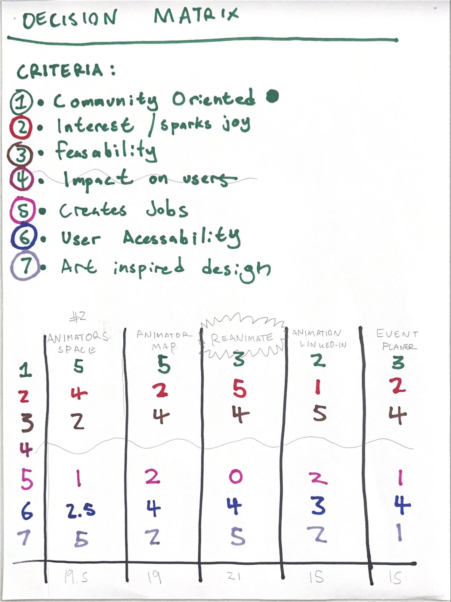 The other two ideas we focused on were an Animator's Cafe and a site called Re-Animate (both shown above). The Animator's Cafe idea was about creating a permanent space for animators to co-work or socialize. The site would be structured like common animation tools so booking space in the cafe would feel very similar to animating and be a more engaging platform than just booking a time slot. The Re-Animate site focused on the idea that one way animators connect with each other is by working on reanimation projects where a group of animators each take a section of a piece of media and re-create it in their style and then all the clips are strung together. This is an interesting opportunity for an animator to both work on their own skills but also collaborate and socialize with other animators. The site would focus on organization of these events so that it's easier to access with wider reach. We ended up going with the AniMap idea for a few different reasons. The main reason is that we found that there isn't a lack of community events and opportunities to socialize; the main block seems to be the ability to share this information. The young, independent animators we talked to enjoy going to events for animators and socializing. They even feel confident that they could arrange their own event if they wanted. As a result, we believe that we don't need to facilitate the type of interaction that fosters connection between animators, we just need to aid the process animators find out about others.