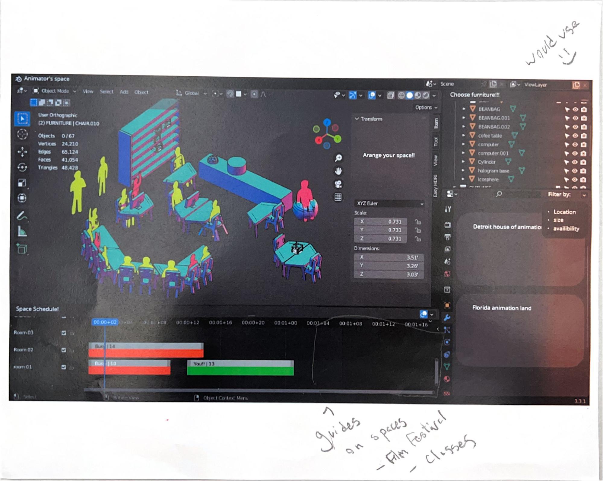 Figure: Above is an annotated sketch model of the Animator's Cafe booking page based on blender. One could design the space using the typical blender workflow. Once they have their spice designed they can use the timeline utility at the bottom of the screen to finalize their booking. Below is a sketch model of the Re-animate website. The sketch shows the main project page which is the page shown to users after they have selected a re-animate project to be a part of.