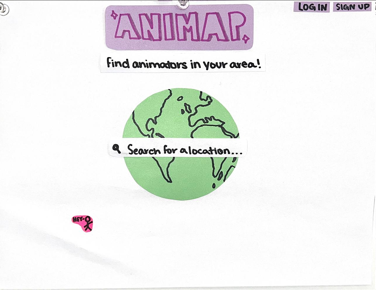 On the homepage of AniMap, users will be presented with a map of the world and a text box to enter more specific information regarding their location (ie. zip code or city name). Once the site has filtered search results to their preferred location, pins will appear on the map of that area representing different local animator profiles and event descriptions. There will also be an option to toggle a list version of this information. A user can hover over the different pins and get a short summary of the profile or event. If the user is interested in the pin, they can then click to get an expanded version with more detailed information. Profiles and event descriptions will have different pin images so they are easy to distinguish. On each profile, there will be information about the animator and what they're interested in as well as their preferred method of contact. Clicking on event pins will show a description of the event and any RSVP details/requirements.