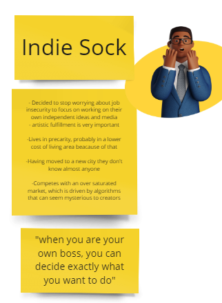The design we have been elaborating so far ties in to the personas we have constructed to better understand the user group we are designing for. Having had more contact with animators, we focused on making something appealing to what we saw as the most common traits that different animators, or people in the business of animation would like. Our persona, Indie Sock is supposed to represent the average independent animator, whose goal is to create their own self-sustaining business through their passion: