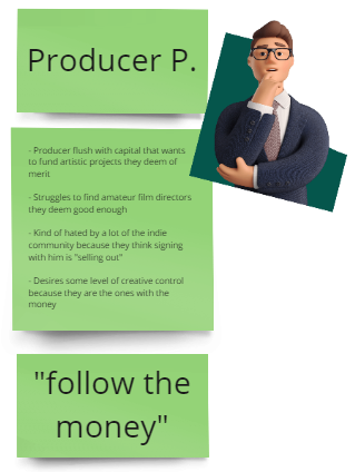 Similarly to Sock, Carrie's interest in AniMap comes from their desire to kick start their animation career by both showing off their work and being able to find other potential work and connections though the website. Just as independent animation a lot of the times works through informal trust relations, successful careers in animation also rely on a person's network and portfolio. This leads us to the final persona, Producer P.: