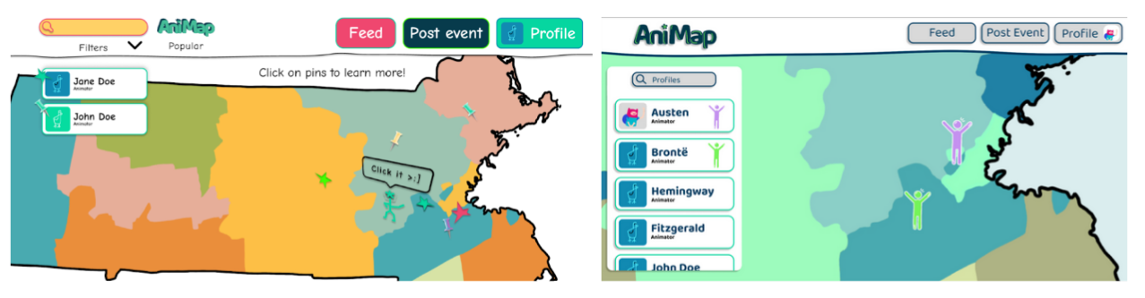 The site opens to a search bar which the user can type their request into with a few commonly searching tags below it. Most of the site revolves around this search feature and its corresponding map. Our concept is to allow users to search for profiles or events that may be related to their interests and then giving them a map of where these people/events are in relation to them. The goal of our design is to create a simple interface to find this kind of information but not necessarily be a social media platform where people can contact one another online. AniMap's emphasis on creating in-person relationships is why there's only a search method but not a built-in feature to chat with another user.